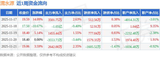 资金流向数据方面,本周清水源主力资金合计净流出6443.71万元,游资资金合计净流入1316.31万元,散户资金合计净流入5127.4万元。本周资金流向一览见下表: