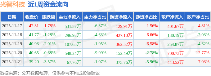 资金流向数据方面,本周光智科技主力资金合计净流出1552.14万元,游资资金合计净流入391.28万元,散户资金合计净流入1160.86万元。本周资金流向一览见下表: