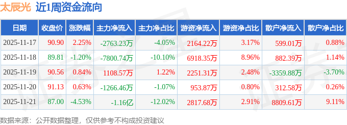 资金流向数据方面,本周太辰光主力资金合计净流出2.23亿元,游资资金合计净流入1.51亿元,散户资金合计净流入7243.72万元。本周资金流向一览见下表: