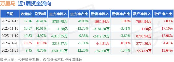 资金流向数据方面,本周万里马主力资金合计净流出3.76亿元,游资资金合计净流出4865.33万元,散户资金合计净流入4.25亿元。本周资金流向一览见下表: