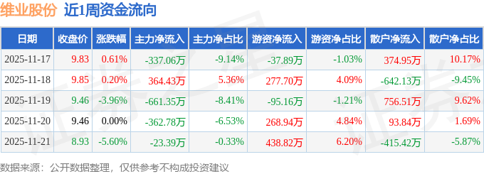 资金流向数据方面,本周维业股份主力资金合计净流出1020.15万元,游资资金合计净流入852.41万元,散户资金合计净流入167.74万元。本周资金流向一览见下表: