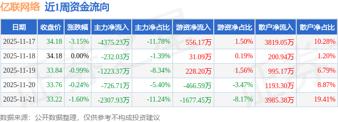 资金流向数据方面,本周亿联网络主力资金合计净流出8865.27万元,游资资金合计净流出1328.59万元,散户资金合计净流入1.02亿元。本周资金流向一览见下表: