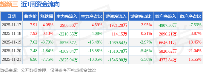 资金流向数据方面,本周超频三主力资金合计净流出1.19亿元,游资资金合计净流出2091.87万元,散户资金合计净流入1.4亿元。本周资金流向一览见下表: