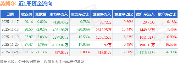 资金流向数据方面,本周英搏尔主力资金合计净流出7634.39万元,游资资金合计净流入4351.85万元,散户资金合计净流入3282.54万元。本周资金流向一览见下表: