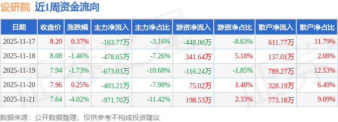 资金流向数据方面,本周设研院主力资金合计净流出2690.37万元,游资资金合计净流入50.95万元,散户资金合计净流入2639.42万元。本周资金流向一览见下表: