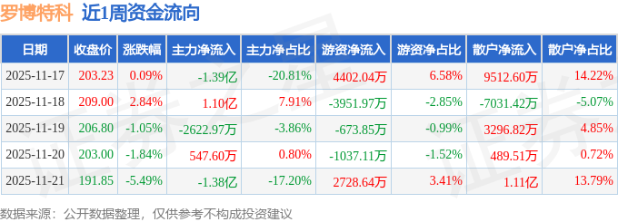 资金流向数据方面,本周罗博特科主力资金合计净流出1.88亿元,游资资金合计净流入1467.74万元,散户资金合计净流入1.73亿元。本周资金流向一览见下表:
