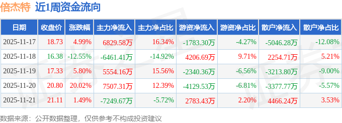 资金流向数据方面,本周倍杰特主力资金合计净流入6179.97万元,游资资金合计净流出1263.07万元,散户资金合计净流出4916.9万元。本周资金流向一览见下表: