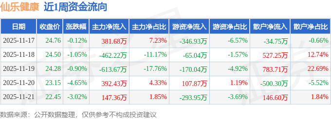 资金流向数据方面,本周仙乐健康主力资金合计净流出154.42万元,游资资金合计净流出768.09万元,散户资金合计净流入922.51万元。本周资金流向一览见下表: