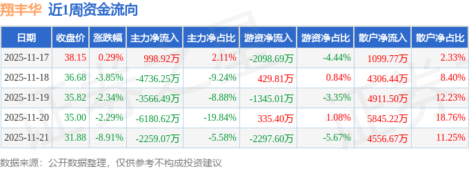 资金流向数据方面,本周翔丰华主力资金合计净流出1.57亿元,游资资金合计净流出4976.09万元,散户资金合计净流入2.07亿元。本周资金流向一览见下表:
