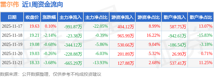 资金流向数据方面,本周雷尔伟主力资金合计净流出2253.54万元,游资资金合计净流入2230.53万元,散户资金合计净流入23.01万元。本周资金流向一览见下表:
