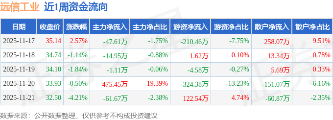 资金流向数据方面,本周远信工业主力资金合计净流入350.1万元,游资资金合计净流出415.26万元,散户资金合计净流入65.15万元。本周资金流向一览见下表: