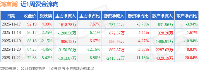 资金流向数据方面,本周鸿富瀚主力资金合计净流出3740.0万元,游资资金合计净流出886.54万元,散户资金合计净流入4626.55万元。本周资金流向一览见下表: