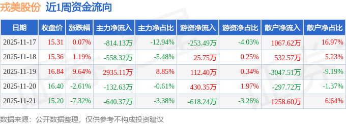 资金流向数据方面,本周戎美股份主力资金合计净流入789.66万元,游资资金合计净流出303.23万元,散户资金合计净流出486.43万元。本周资金流向一览见下表: