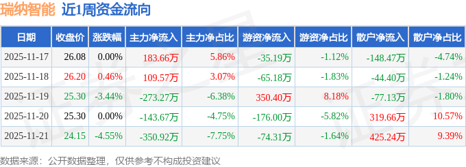 资金流向数据方面,本周瑞纳智能主力资金合计净流出474.63万元,游资资金合计净流出0.28万元,散户资金合计净流入474.91万元。本周资金流向一览见下表: