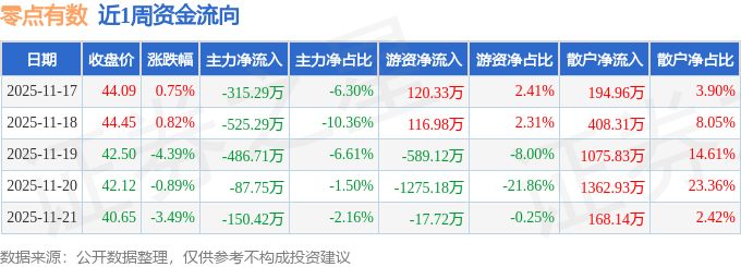 资金流向数据方面,本周零点有数主力资金合计净流出1565.46万元,游资资金合计净流出1644.71万元,散户资金合计净流入3210.17万元。本周资金流向一览见下表: