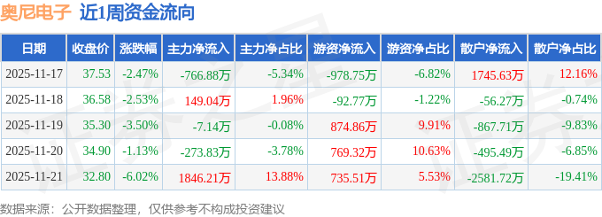 资金流向数据方面,本周奥尼电子主力资金合计净流入947.39万元,游资资金合计净流入1308.17万元,散户资金合计净流出2255.56万元。本周资金流向一览见下表: