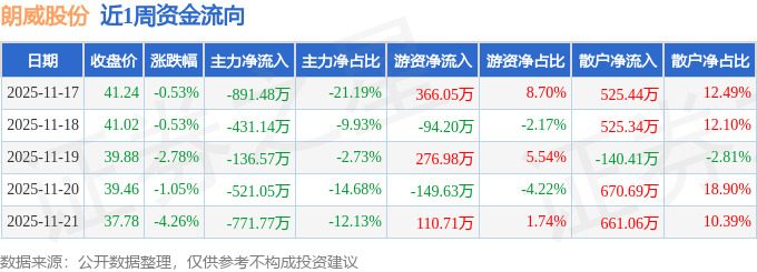 资金流向数据方面,本周朗威股份主力资金合计净流出2752.01万元,游资资金合计净流入509.9万元,散户资金合计净流入2242.12万元。本周资金流向一览见下表: