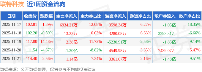 资金流向数据方面,本周联特科技主力资金合计净流入3.01亿元,游资资金合计净流入9559.16万元,散户资金合计净流出3.97亿元。本周资金流向一览见下表: