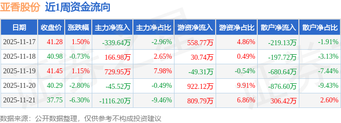 资金流向数据方面,本周亚香股份主力资金合计净流出604.44万元,游资资金合计净流入2272.11万元,散户资金合计净流出1667.67万元。本周资金流向一览见下表: