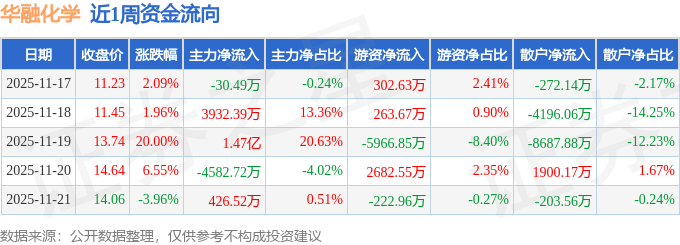 资金流向数据方面,本周华融化学主力资金合计净流入1.44亿元,游资资金合计净流出2940.96万元,散户资金合计净流出1.15亿元。本周资金流向一览见下表: