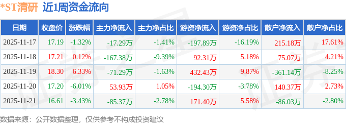 资金流向数据方面,本周*ST清研主力资金合计净流出287.4万元,游资资金合计净流入303.94万元,散户资金合计净流出16.54万元。本周资金流向一览见下表: