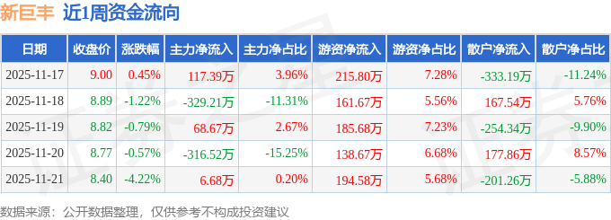 资金流向数据方面,本周新巨丰主力资金合计净流出453.0万元,游资资金合计净流入896.39万元,散户资金合计净流出443.39万元。本周资金流向一览见下表: