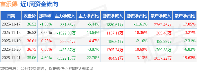 资金流向数据方面,本周富乐德主力资金合计净流出5975.81万元,游资资金合计净流入780.01万元,散户资金合计净流入5195.8万元。本周资金流向一览见下表: