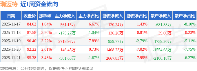 资金流向数据方面,本周瑞迈特主力资金合计净流入2689.65万元,游资资金合计净流入3372.79万元,散户资金合计净流出6062.44万元。本周资金流向一览见下表: