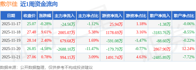 资金流向数据方面,本周敷尔佳主力资金合计净流入966.23万元,游资资金合计净流入1925.5万元,散户资金合计净流出2891.73万元。本周资金流向一览见下表: