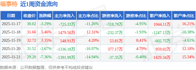 资金流向数据方面,本周福事特主力资金合计净流出1425.08万元,游资资金合计净流出157.52万元,散户资金合计净流入1582.6万元。本周资金流向一览见下表:
