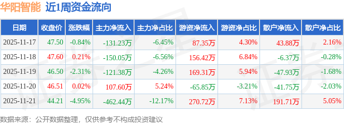 资金流向数据方面,本周华阳智能主力资金合计净流出757.5万元,游资资金合计净流入617.95万元,散户资金合计净流入139.55万元。本周资金流向一览见下表: