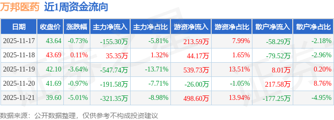 资金流向数据方面,本周万邦医药主力资金合计净流出1180.61万元,游资资金合计净流入1270.1万元,散户资金合计净流出89.48万元。本周资金流向一览见下表: