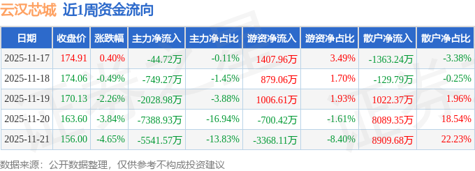 资金流向数据方面,本周云汉芯城主力资金合计净流出1.58亿元,游资资金合计净流出774.9万元,散户资金合计净流入1.65亿元。本周资金流向一览见下表: