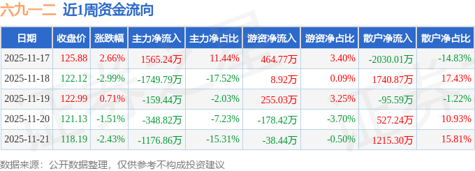资金流向数据方面,本周六九一二主力资金合计净流出1869.66万元,游资资金合计净流入511.85万元,散户资金合计净流入1357.81万元。本周资金流向一览见下表: