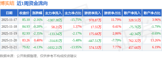 资金流向数据方面,本周博实结主力资金合计净流出2729.53万元,游资资金合计净流入1299.11万元,散户资金合计净流入1430.41万元。本周资金流向一览见下表: