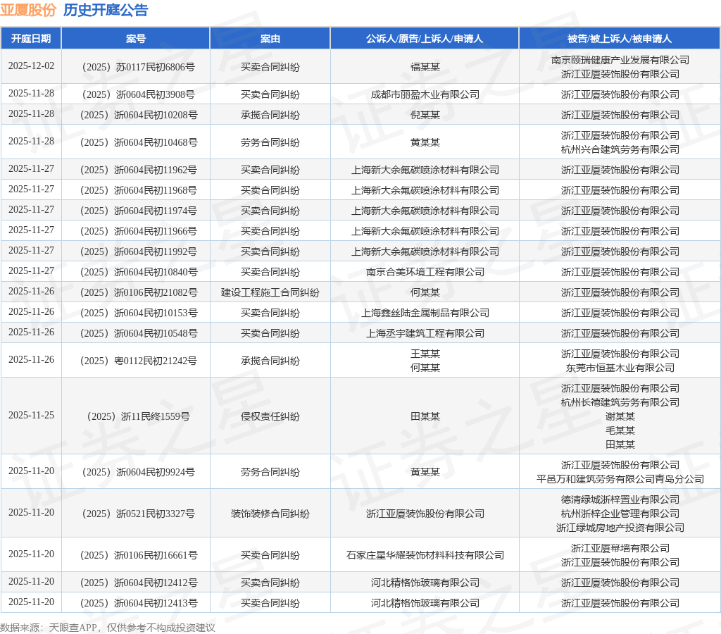 案号:(2025)粤0112民初21242号根据统计,近一年内以浙江亚厦装饰股份有限公司为当事人的历史开庭公告有582则,其中案由为“买卖合同纠纷”的公告以207则居首,其次为“劳务合同纠纷”有109则,“建设工程施工合同纠纷”有63则。历史开庭公告(前20条)如下: