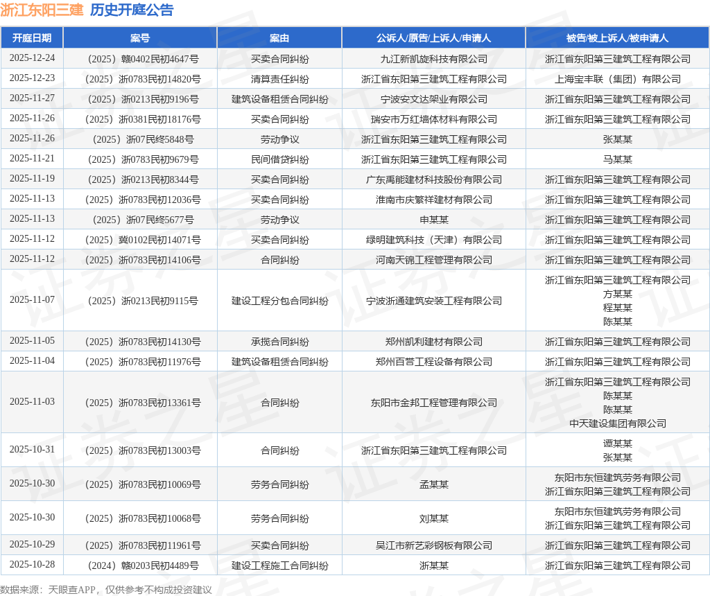 案号:(2025)浙07民终5848号根据统计,近一年内以浙江省东阳第三建筑工程有限公司为当事人的历史开庭公告有133则,其中案由为“买卖合同纠纷”的公告以36则居首,其次为“建设工程施工合同纠纷”有16则,“劳务合同纠纷”有15则。历史开庭公告(前20条)如下: