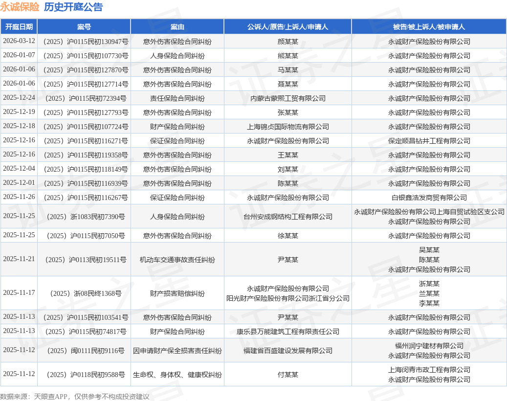 案号:(2025)沪0115民初116267号根据统计,近一年内以永诚财产保险股份有限公司为当事人的历史开庭公告有252则,其中案由为“意外伤害保险合同纠纷”的公告以114则居首,其次为“机动车交通事故责任纠纷”有27则,“人身保险合同纠纷”有23则。历史开庭公告(前20条)如下: