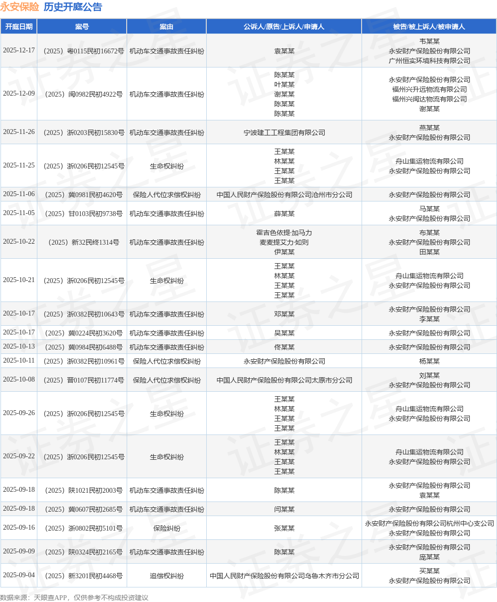 案号:(2025)浙0203民初15830号根据统计,近一年内以永安财产保险股份有限公司为当事人的历史开庭公告有122则,其中案由为“机动车交通事故责任纠纷”的公告以69则居首,其次为“保险人代位求偿权纠纷”有16则,“侵权责任纠纷”有7则。历史开庭公告(前20条)如下: