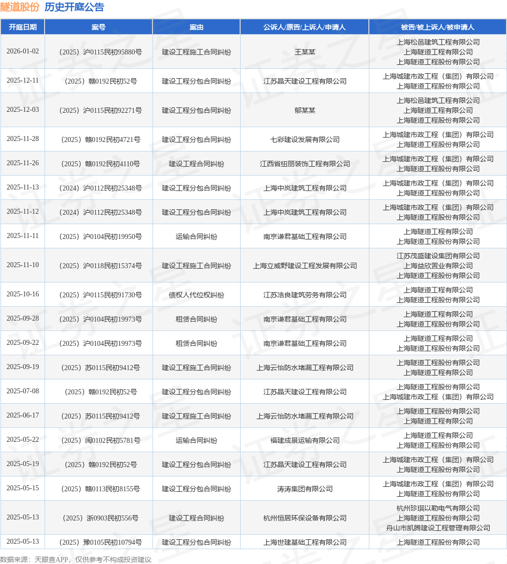 案号:(2025)赣0192民初4110号根据统计,近一年内以上海隧道工程股份有限公司为当事人的历史开庭公告有34则,其中案由为“建设工程分包合同纠纷”的公告以10则居首,其次为“建设工程施工合同纠纷”有9则,“买卖合同纠纷”有5则。历史开庭公告(前20条)如下: