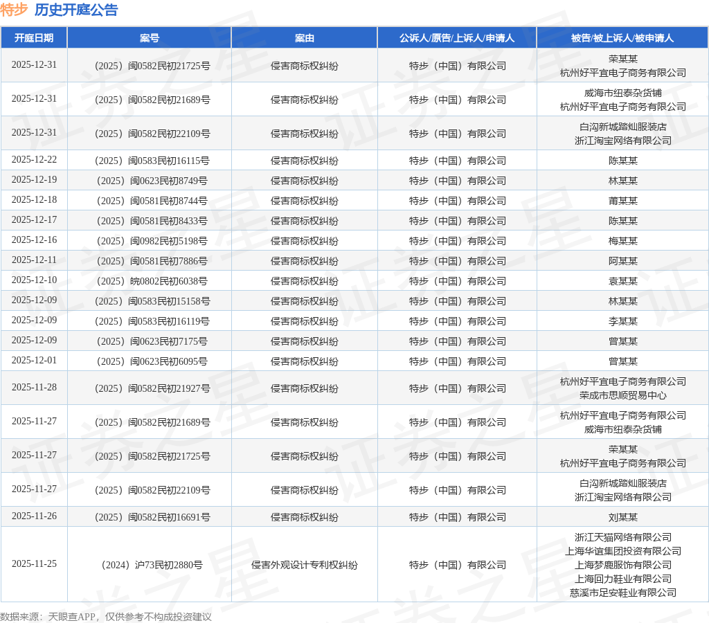 案号:(2025)闽0582民初16691号根据统计,近一年内以特步(中国)有限公司为当事人的历史开庭公告有294则,其中案由为“侵害商标权纠纷”的公告以232则居首,其次为“侵害外观设计专利权纠纷”有23则,“侵害商标权”有18则。历史开庭公告(前20条)如下: