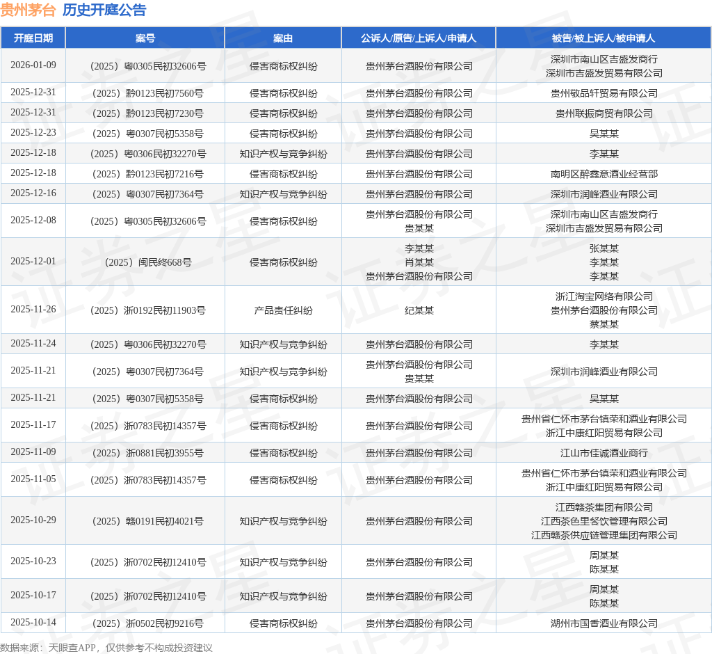 案号:(2025)浙0192民初11903号根据统计,近一年内以贵州茅台酒股份有限公司为当事人的历史开庭公告有204则,其中案由为“侵害商标权纠纷”的公告以145则居首,其次为“商标权权属、侵权纠纷”有19则,“侵害商标权”有9则。历史开庭公告(前20条)如下: