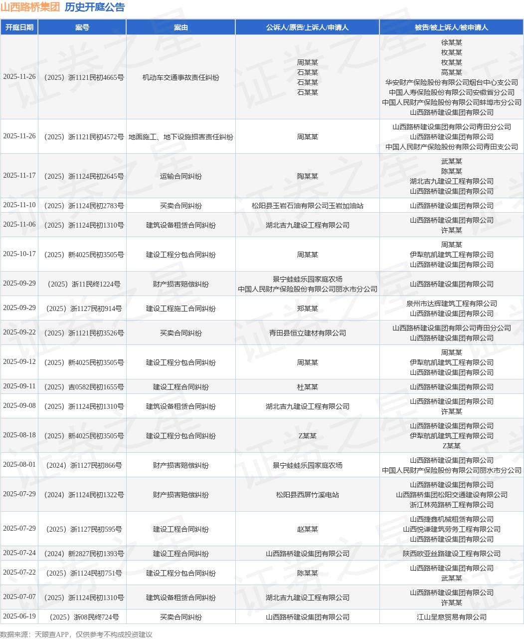 案号:(2025)浙1121民初4665号根据统计,近一年内以山西路桥建设集团有限公司为当事人的历史开庭公告有41则,其中案由为“建设工程分包合同纠纷”的公告以7则居首,其次为“买卖合同纠纷”有6则,“劳务合同纠纷”有6则。历史开庭公告(前20条)如下: