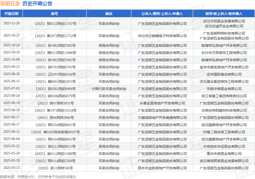 案号:(2025)鄂0112民初12747号根据统计,近一年内以广东坚朗五金制品股份有限公司为当事人的历史开庭公告有62则,其中案由为“买卖合同纠纷”的公告以42则居首,其次为“承揽合同纠纷”有6则,“票据追索权纠纷”有6则。历史开庭公告(前20条)如下: