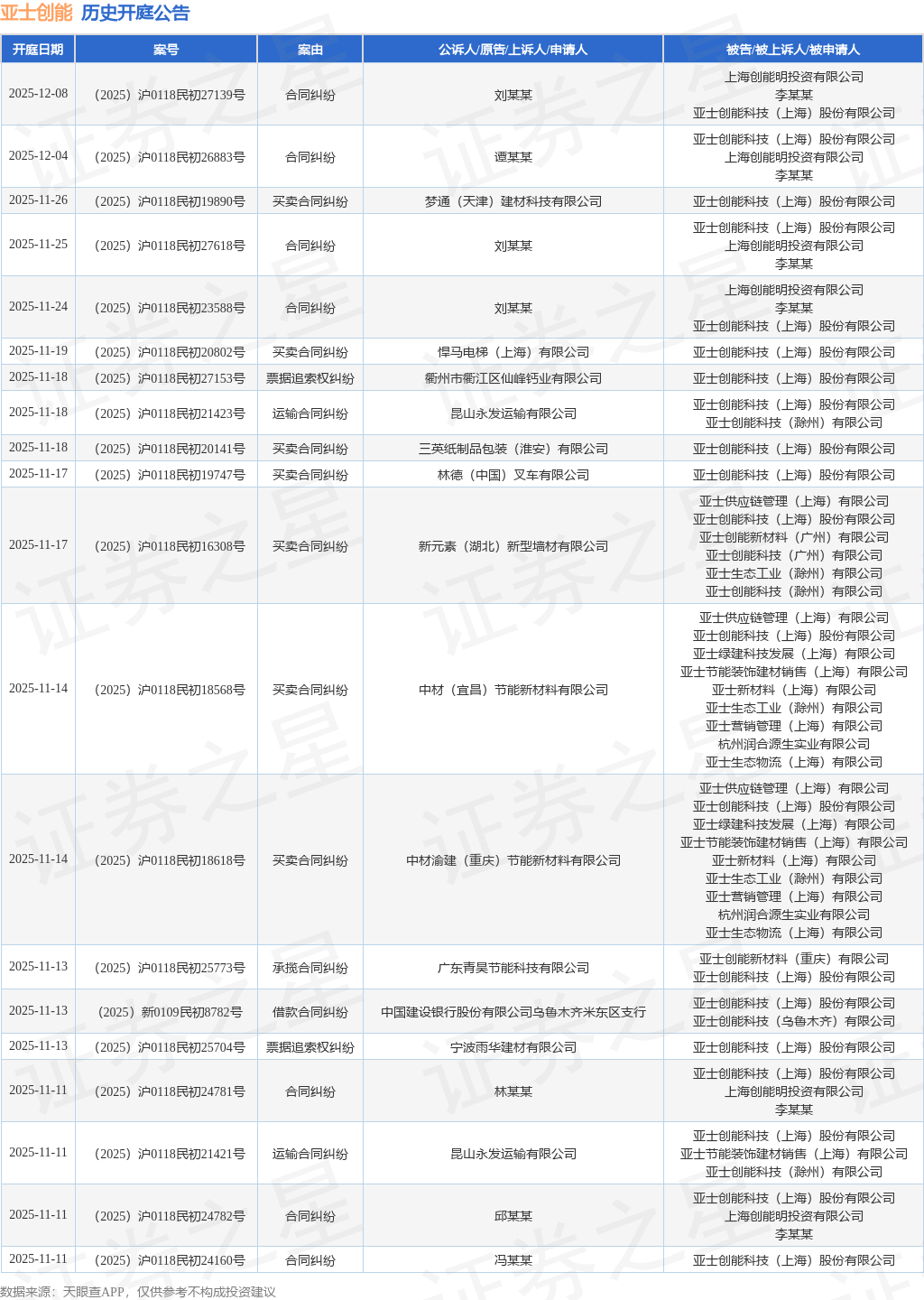 证券之星消息,根据天眼查APP显示,近日公布了一则亚士创能科技(上海)股份有限公司作为被告/被上诉人的开庭公告,详细内容如下: