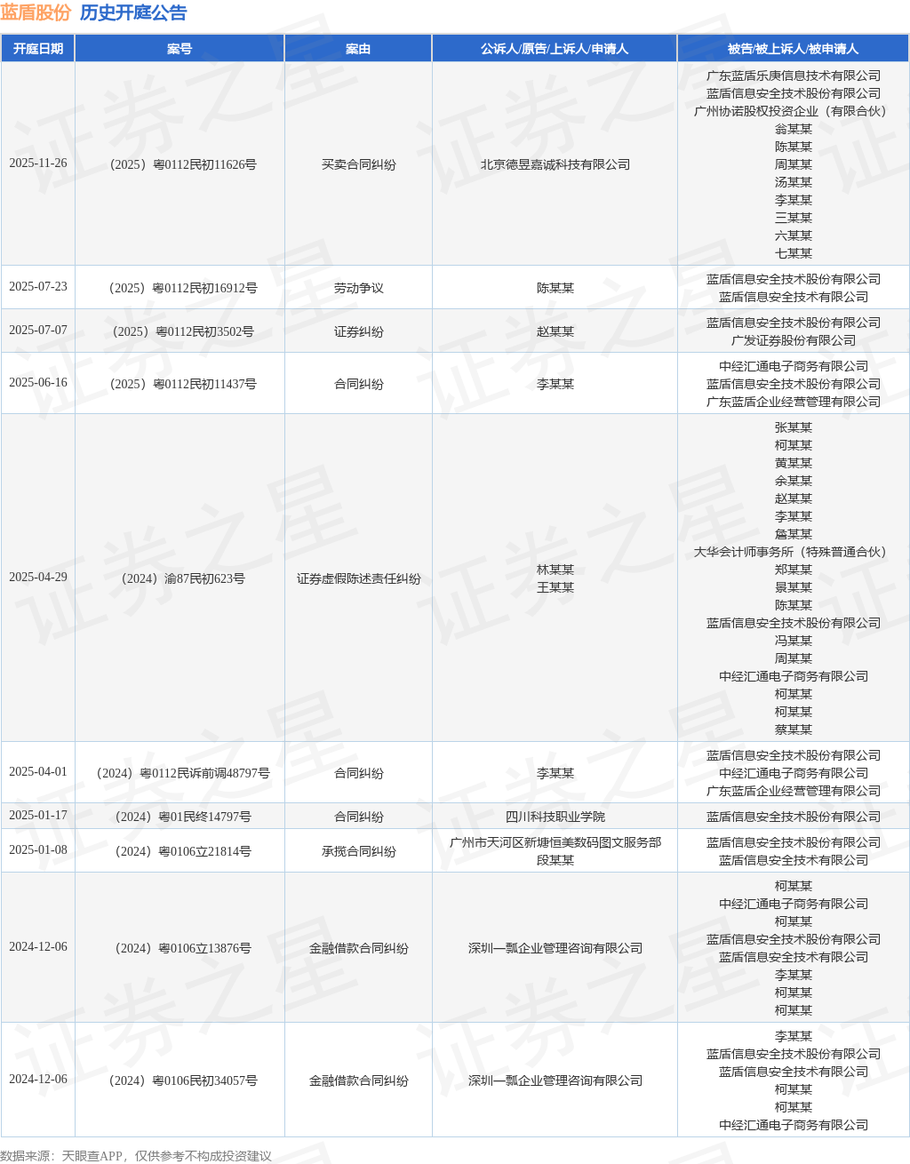 案号:(2025)粤0112民初11626号根据统计,近一年内以蓝盾信息安全技术股份有限公司为当事人的历史开庭公告有10则,其中案由为“合同纠纷”的公告以3则居首,其次为“金融借款合同纠纷”有2则,“买卖合同纠纷”有1则。历史开庭公告如下: