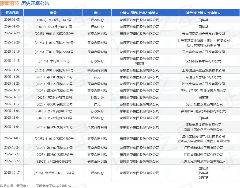 案号:(2025)粤0308民初3679号根据统计,近一年内以蒙娜丽莎集团股份有限公司为当事人的历史开庭公告有216则,其中案由为“买卖合同纠纷”的公告以150则居首,其次为“行政纠纷”有34则,“其他”有10则。历史开庭公告(前20条)如下: