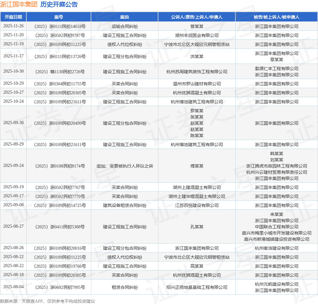 案号:(2025)浙0111民初14618号根据统计,近一年内以浙江国丰集团有限公司为当事人的历史开庭公告有68则,其中案由为“买卖合同纠纷”的公告以15则居首,其次为“劳务合同纠纷”有14则,“建设工程施工合同纠纷”有11则。历史开庭公告(前20条)如下: