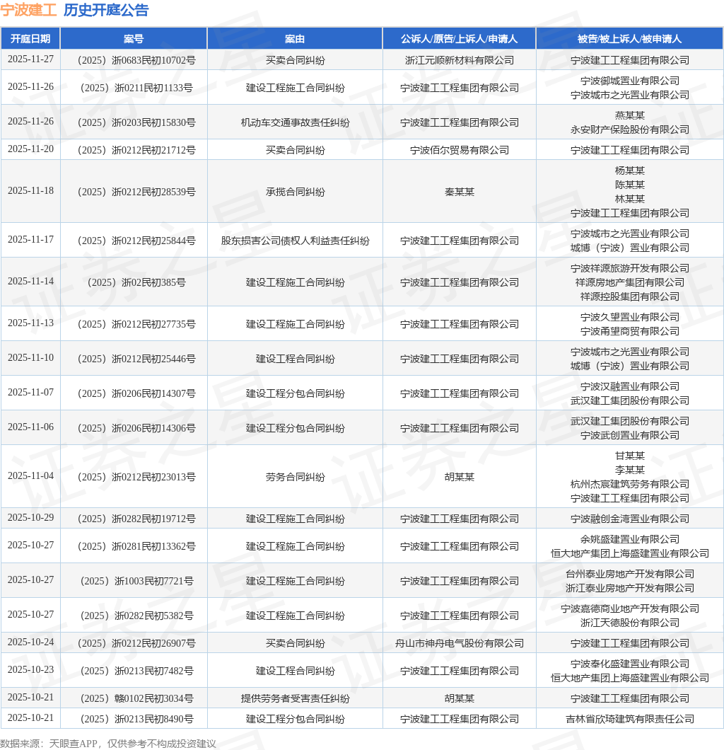 案号:(2025)浙0211民初1133号根据统计,近一年内以宁波建工工程集团有限公司为当事人的历史开庭公告有129则,其中案由为“建设工程施工合同纠纷”的公告以32则居首,其次为“买卖合同纠纷”有30则,“建设工程合同纠纷”有19则。历史开庭公告(前20条)如下: