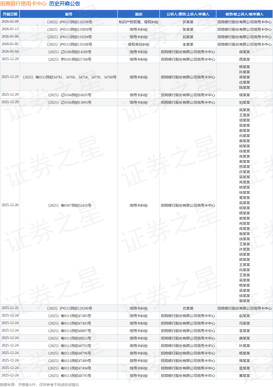 案号:(2025)沪0115民初106493号根据统计,近一年内以招商银行股份有限公司信用卡中心为当事人的历史开庭公告有10849则,其中案由为“信用卡纠纷”的公告以8721则居首,其次为“金融借款合同纠纷”有1941则,“合同纠纷”有76则。历史开庭公告(前20条)如下: